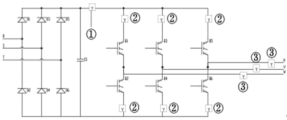 图2中②用于检测两桥臂的中的电流差,由于换相失败很容易使一相中上下两桥臂中的IBGT模块因过流而损坏,此时要求短路电流保护在短路检出后10us内切断门驱动电路,这种逆变器必须采用快速过电流保护装置,可以用霍尔电流传感器检测每个桥臂中的电流,若因换相失败造成上下桥臂同时导电,则相应的两个传感器同时检出电流信号,经与基准电压比较转换成方波后,通过门电路控制封锁所有的逆变触发脉冲,切断短路途径,保护昂贵的IBGT模块;