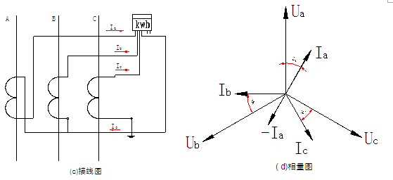 正确接线时的有功功率为:P=Pa+ Pb+ Pc =UaIa.cosφa+ Ub.Ib.cosφb+Uc.Ic.cosφc;